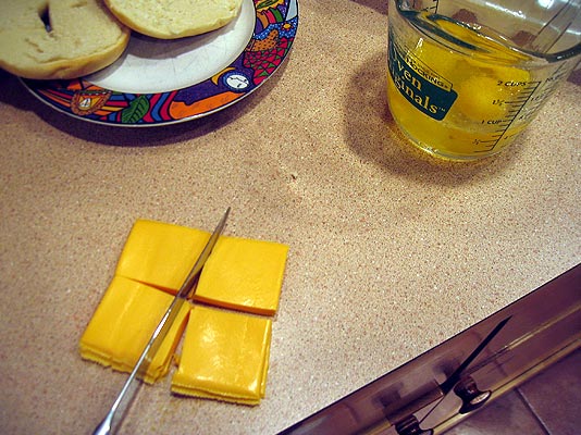 - 3 pieces of sliced cheese (2 for a lighter meal [I would use a block of cheese if I had one, all we have is individually wrapped cheese)