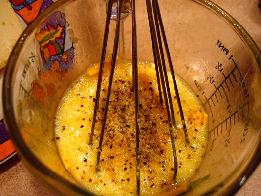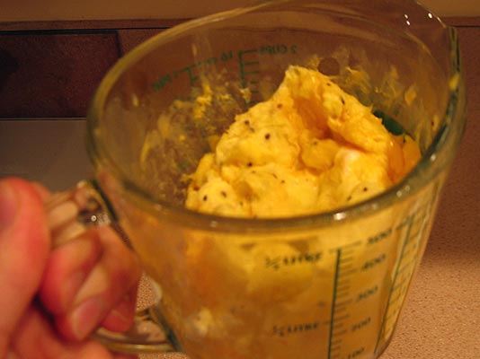 You can tell your eggs are done because they will have turned a slightly darker shade of egg, and the mass of quivering fluff will have stopped rising and bubbling/foaming. And be careful, thicky! The measuring cup will be hot like Satan's balls.