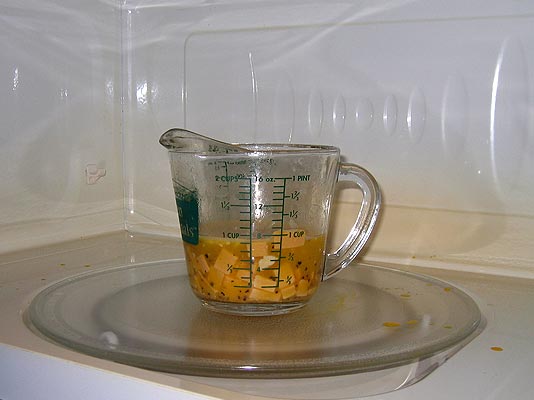 Now stick your mass of yum in the microwave. Heat it up for oh say, four minutes. Chances are you will need to stop it half way through, however.