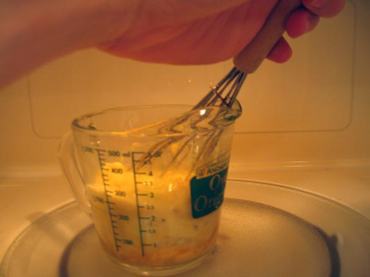 NOW LISTEN UP, DICKSPIGGOT. IF YOU FUCK THIS UP, YOU'RE FUCKED. If you notice that the bottom of your mixture is staying uncooked and liquidy (which it almost always will be) then stop the timer with about a minute to go, and stab it a few times with your whisk. This will stir it up and help it cook more evenly.
