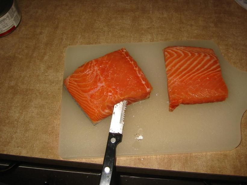 2) Slice open the glory hole. You have two choices, you can cut a simple square pocket in the middle of the meat like I did or you can cut a small opening and pivot the knife inside to create a "hidden pocket" of crab that is not easily seen at first. Your call. Also, do not fuck your uncooked salmon steak. Bacteria man, this isn't sushi grade.