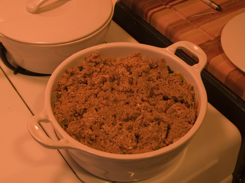 Spread this mixture over the top of your veggies, and bake at 350F for 15-20 minutes, until the top is all crunchy.