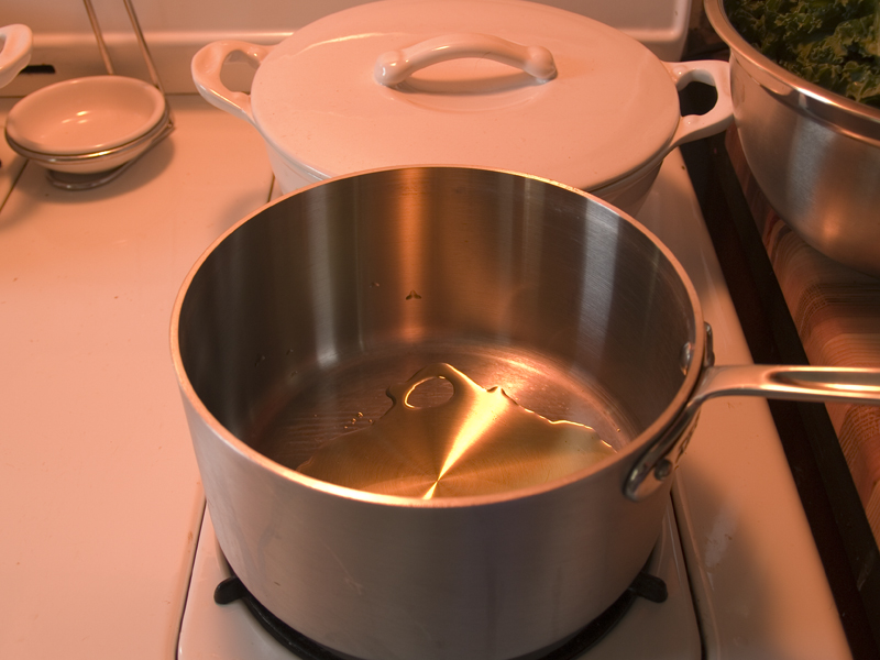 Pour about 2 tablespoons into a medium saucepan, or large (14-16 inch) skillet, in my case the saucepan. Heat it over medium-high heat, until hot but not smoking.