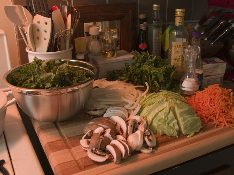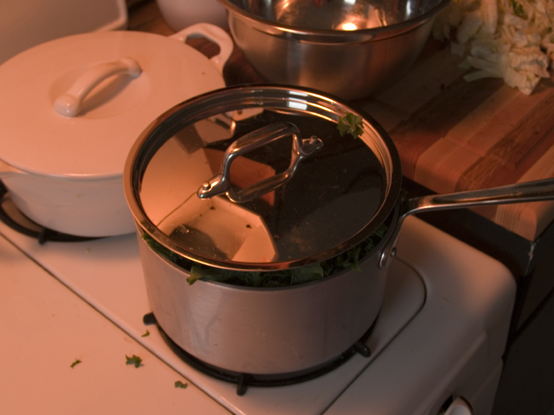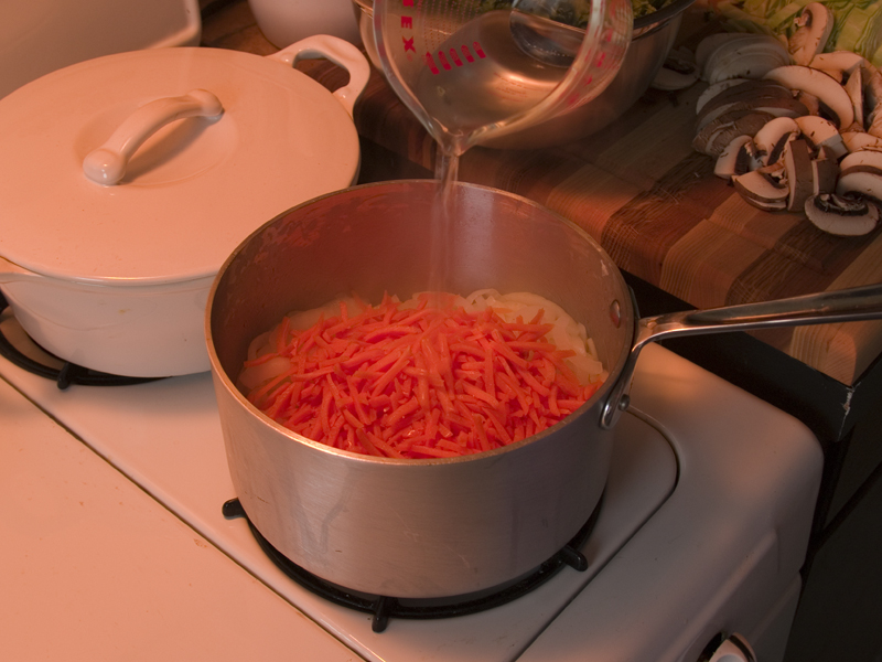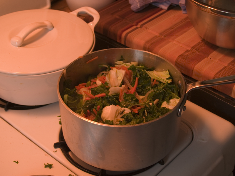 Turn your heat down to medium, and add 1/2 cup water, about 1/2 tsp salt, your soy sauce, and all your veggies except for the garlic.