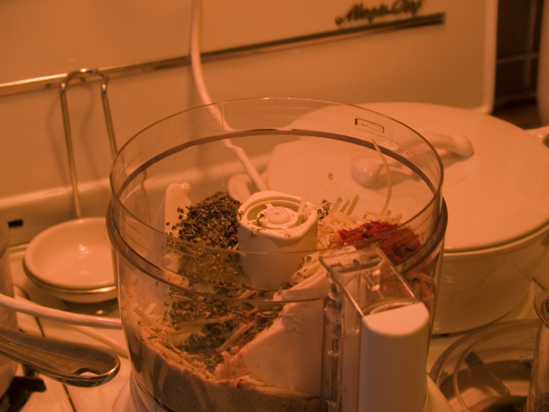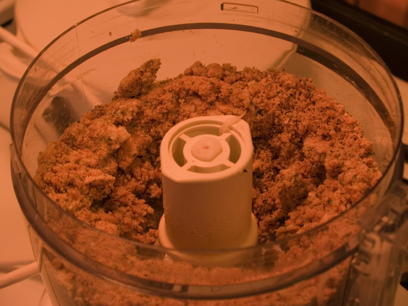 Now, in a food processor, blender, or with a potato masher, mix together your tofu, bread crumbs, cheese, 1/3 cup olive oil, the garlic and all your spices. Pulse until it's consistently mixed.