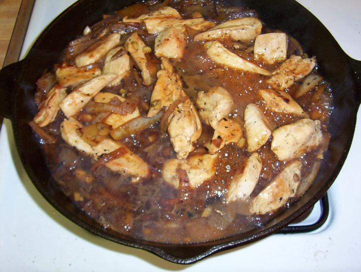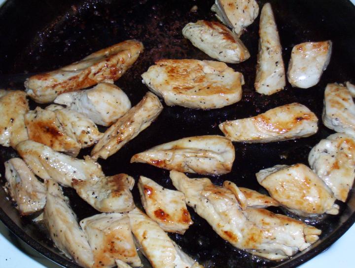 Heat a deep heavy frying pan, I recommend cast iron. When hot, add olive oil and chicken.