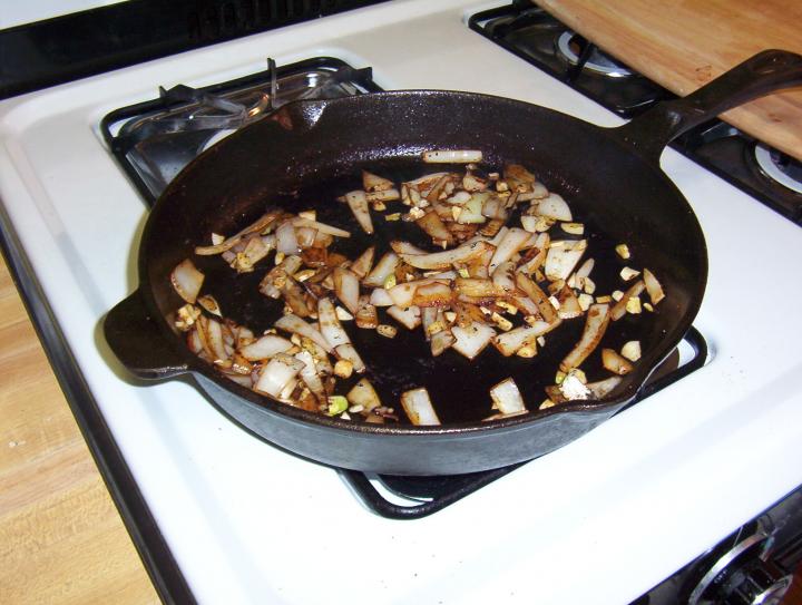 Throw your onions and salt in the pan and cook until the onions are soft. Then add garlic and thyme, cook for another minute.