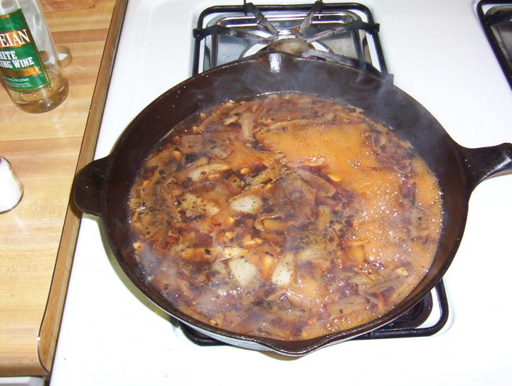Now add your white wine and stir, scrape up anything stuck to the pan. Bring to a boil and let it go for 1 minute.
