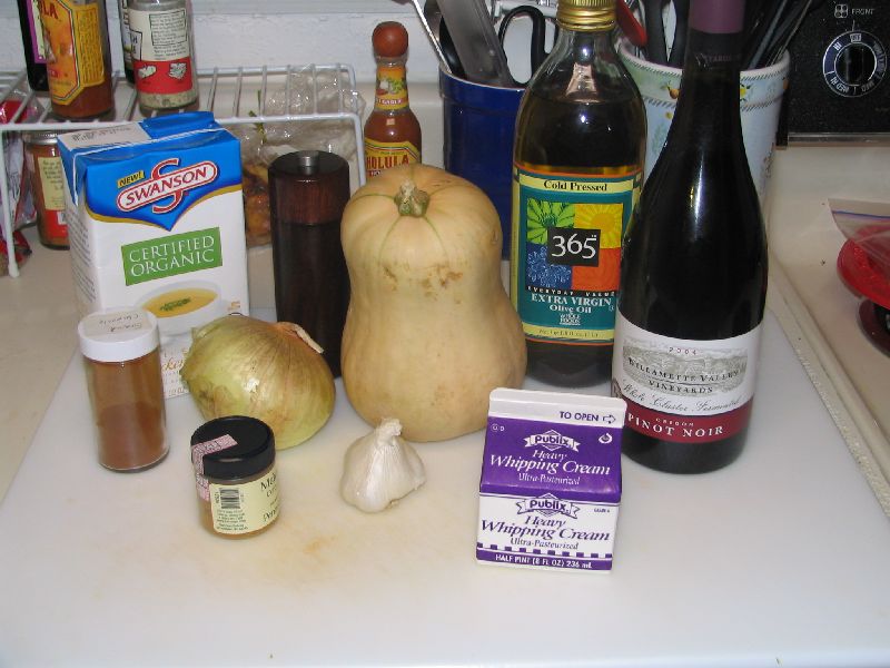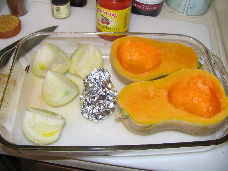 Cut the butternut squash in half, very carefully, and scoop out the seeds and strings. Peel and quarter the onion. Slice the top 1/4 off the head of garlic and wrap in tinfoil. Place the vegetables on a roasting or baking pan and brush the onion and squash with olive oil, and pour olive oil over the top of the garlic before closing.