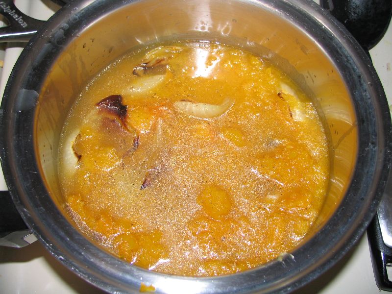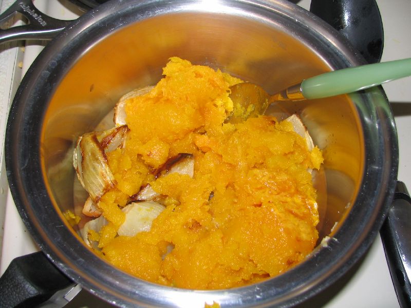 Scoop the cooked squash flesh into a large pot with a spoon. Add the onion and squeeze the garlic out of the bulb.