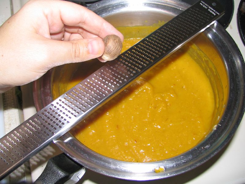 Stir in heavy cream and nutmeg (fresh ground, please!) and adjust seasonings to taste. Keep over low heat until warmed through.