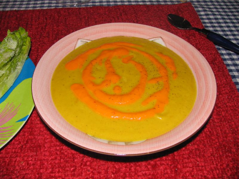 This is a recipe that I developed last Thanksgiving on a whim. It's a rustic style bisque, not strained, though you can certainly strain it if you like. This serves four as a soup course, or two as a main course with salad or bread. It may seem like a small amount of chile powder, but 1/4 teaspoon gave almost overwhelming heat with the curry powder (Penzey's Majaraja blend). The pinot noir is the beverage of choice tonight, as it will be served with osso buco style chicken thighs.