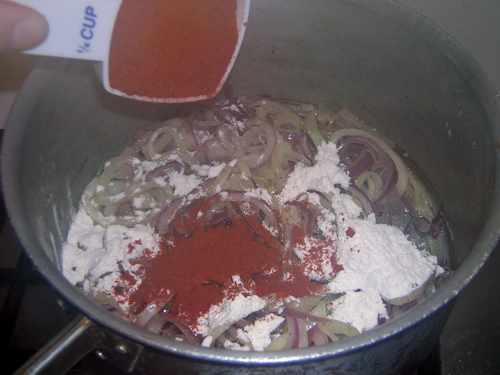 Reduce the heat slightly. Cook, stirring often, until the onions just begin to color (about 10 minutes). Sprinkle the paprika and flour over the onions.