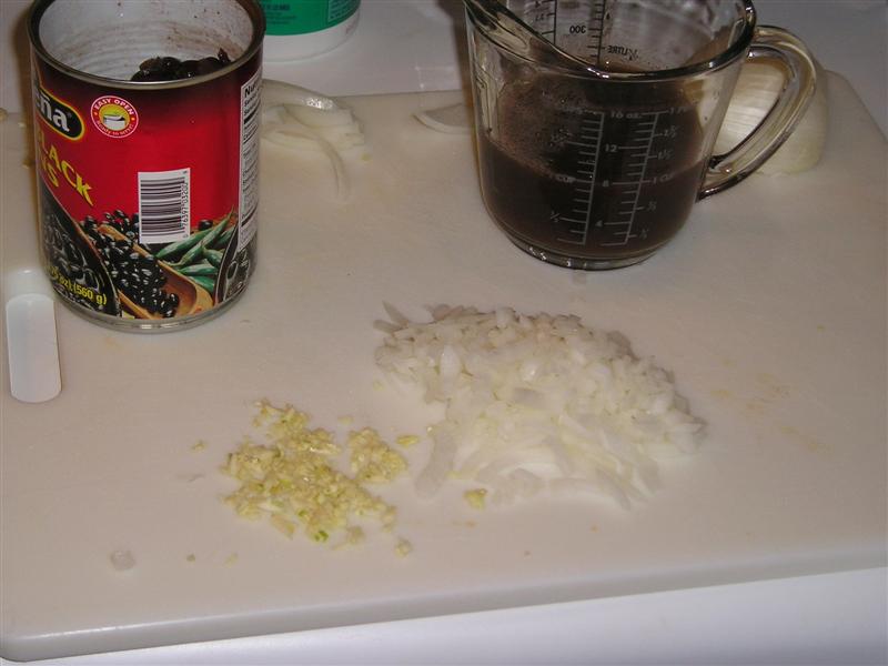 First off we're going to make refried black beans. Peel and mince a couple cloves of garlic. Halve your onion and chop. Open your beans and drain, reserving liquid.
