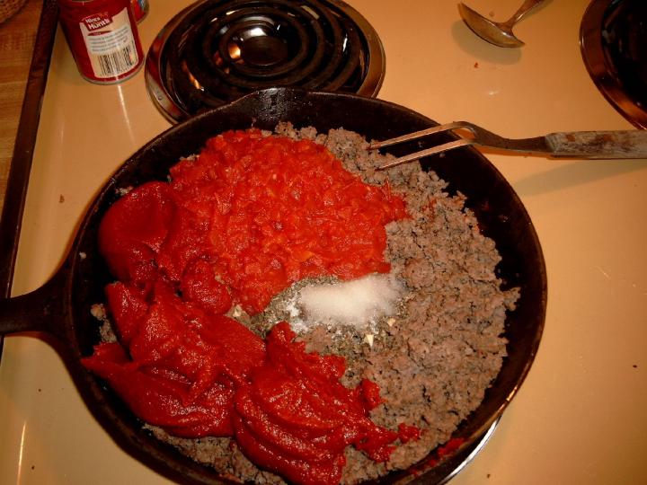 Add the garlic, basil, salt, tomatoes, and tomato paste to the meat