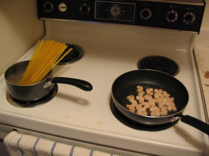 Hello! I'm going to show you how I make this dish, whose name I am not aware of, so I am calling it zesty shrimp pasta. This is an easy dish to make, if you take the simple route (which I will show you, because I am lazy and cheap). We'll be making two servings of it. What you will need to go to the store for: