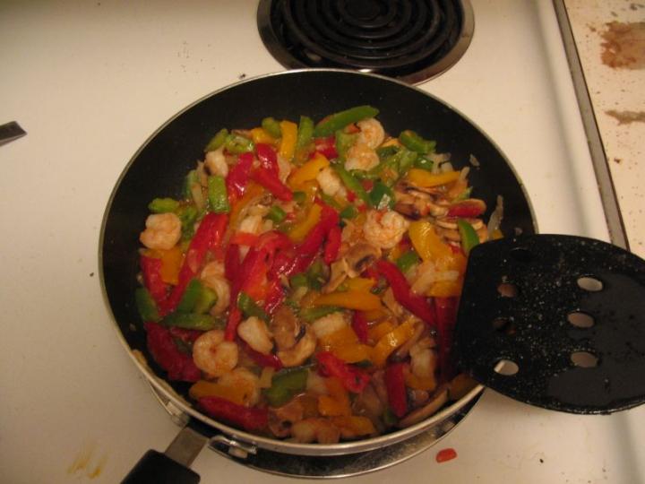 When your shrimp is cooked or near enough, DRAIN THE PAN, dump in some more olive oil, and toss in the tomato, onion, and mushrooms. Coat them with your desired spices, but do NOT put in more than a tiny bit of garlic. It really doesn't taste good in large quantities here. I load up on Cayanne, because I like that stuff.