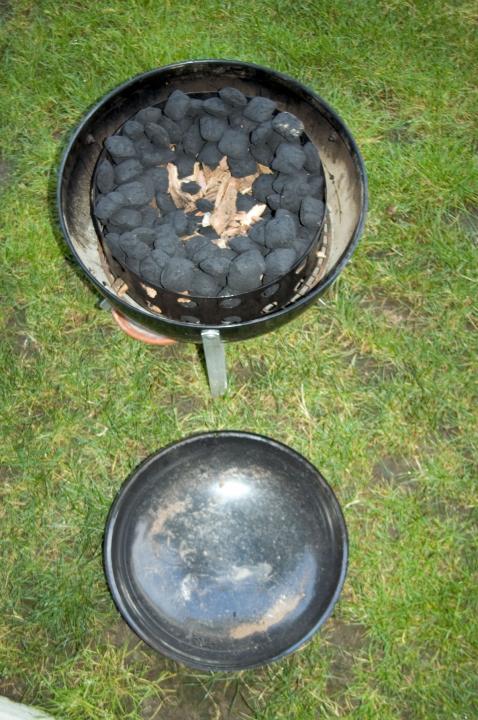 First, I filled the coal-ring with about half-way with Kingsford (regular, for the love of god, not match-light!), and then laid down a layer of mesquite chips. Don't bother soaking the chips, there's not enough air-flow for them to combust in this kind of cooker: