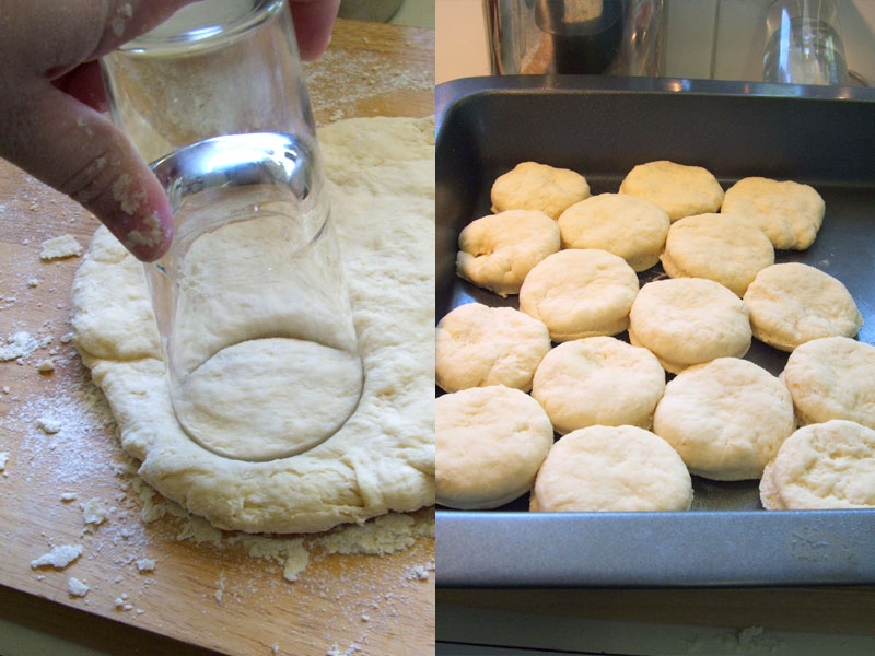 Cut into small rounds, I don't have a good size cutter so I use a large shot glass. Place the rounds close together on a lightly greased baking tray.